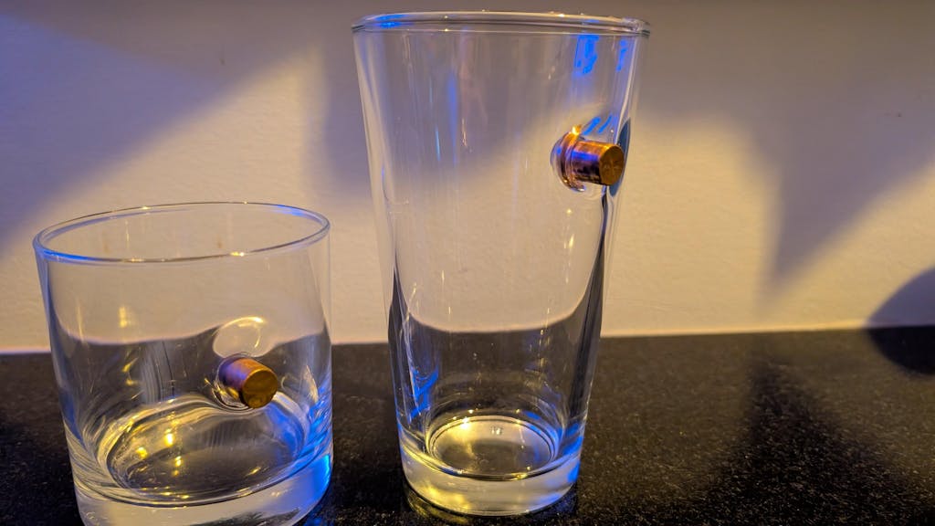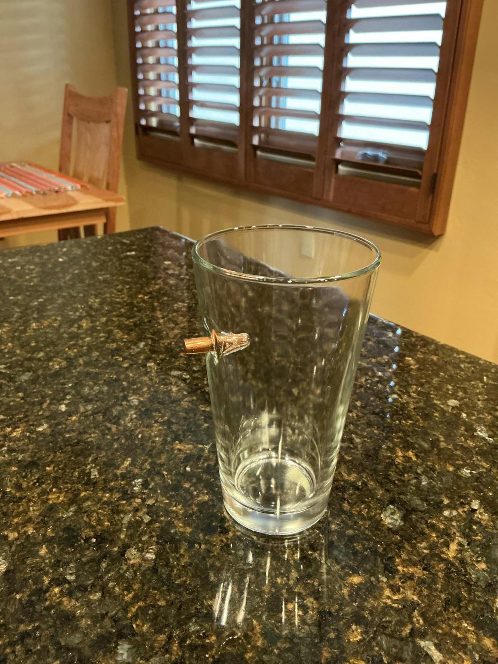 Whether you're gifting to a fellow patriot or adding a striking piece to your home bar, this 16oz pint glass turns an ordinary drink into a conversation starter. Each glass is hand embedded with a real, lead-free bullet.