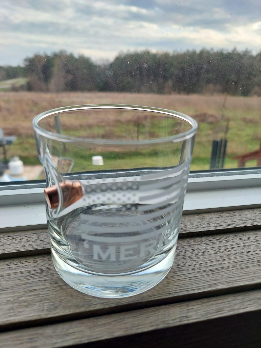 This 11oz whiskey rocks glass features a real 0.308 or 0.45ACP bullet and custom laser engraved with our best selling ‘Merica design. Each glass is hand embedded with a real, lead-free bullet.