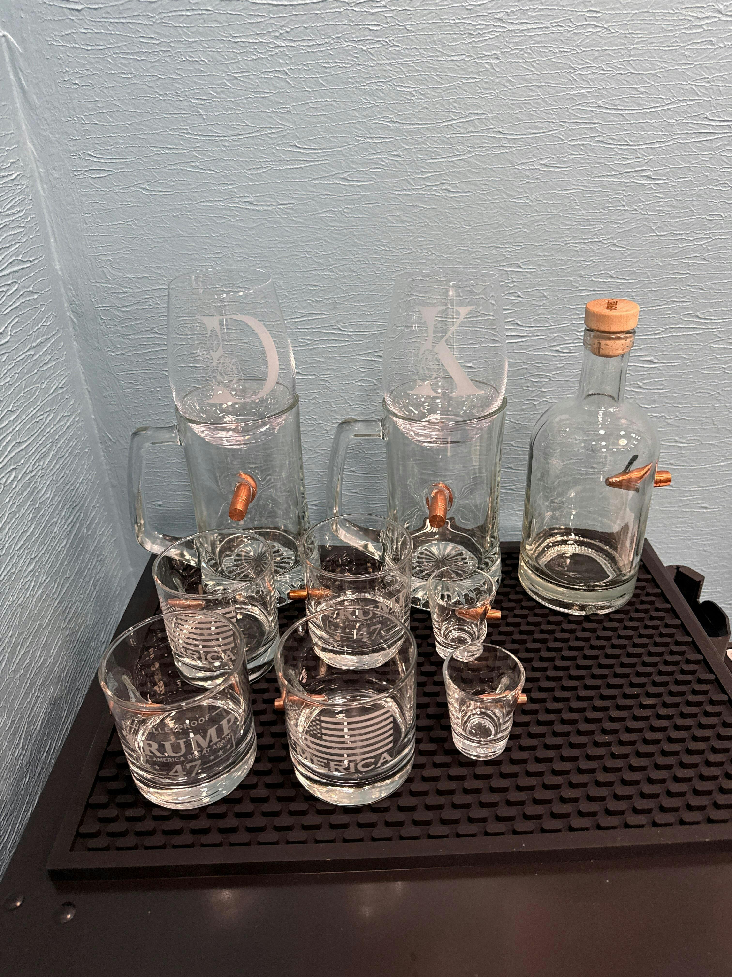 The 750mL decanter is hand-embedded with a real, lead-free 0.50BMG bullet and the two 11oz rocks glasses are hand-embedded with .308 caliber bullets. Each glass is laser etched with our best selling 'Merica design.