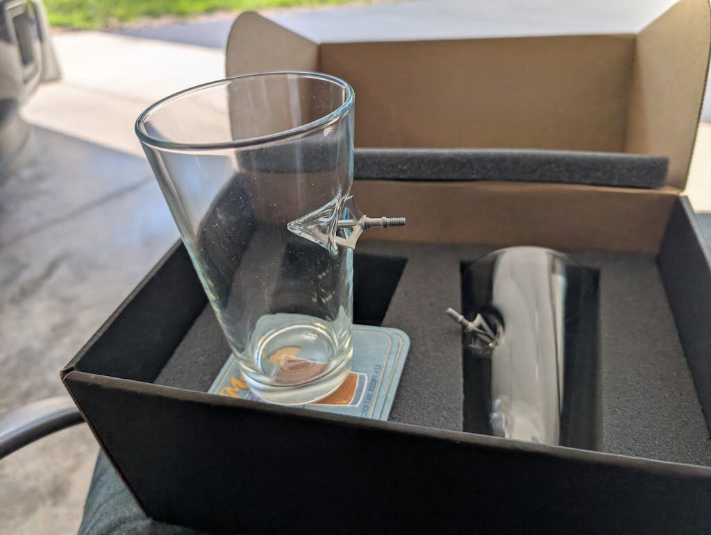Built for bowhunters and archery fanatics, Each glass is hand-embedded with a Pre-Season Fixed-Blade Broadhead and makes a killer gift for anyone who lives for the hunt or has tree stand stories for days.