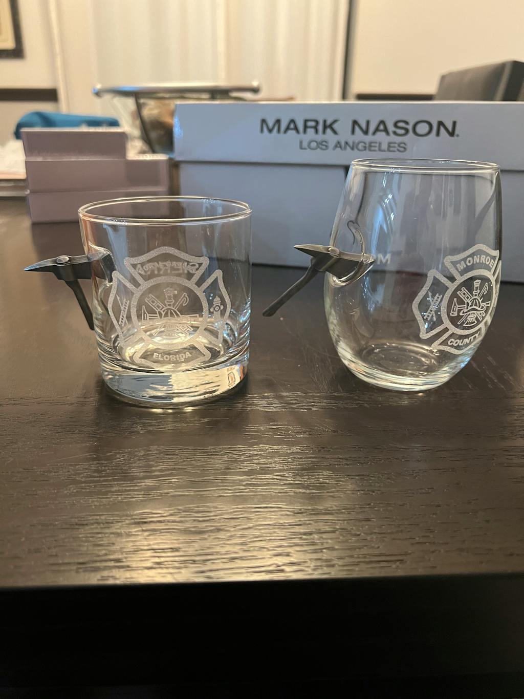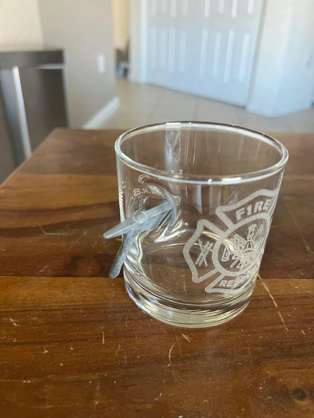 - Solid metal miniature fire axe embedded into the side of the glass