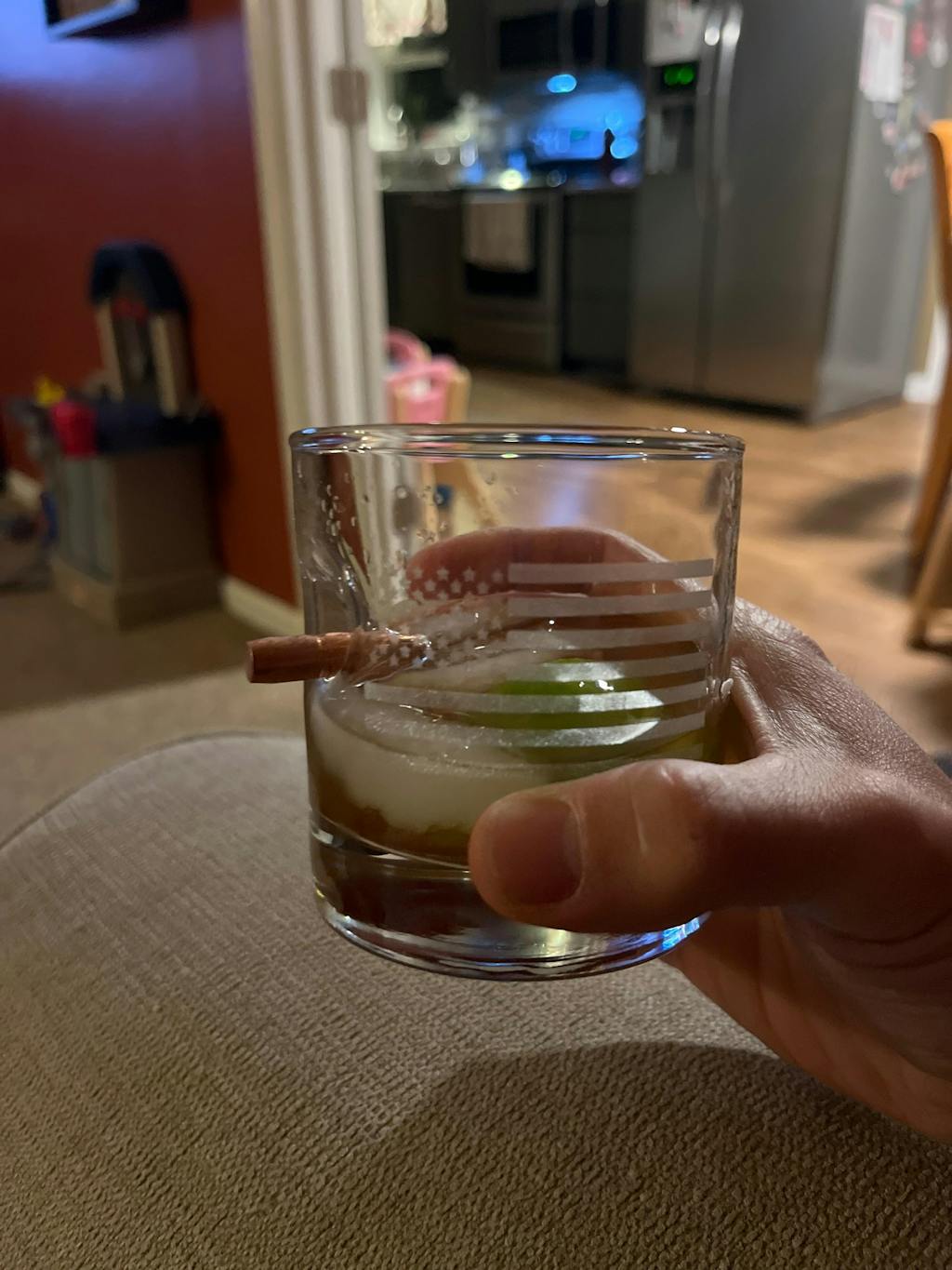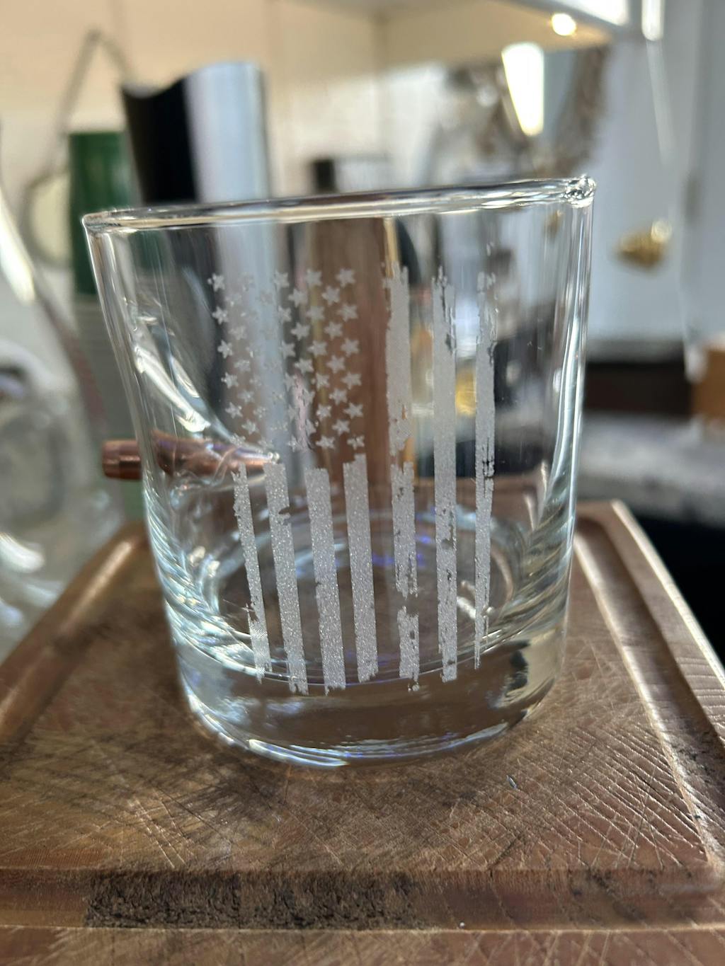 This 11oz whiskey rocks glass is hand-embedded with a real, lead-free .308 bullet and custom laser etched with a distressed American Flag design.