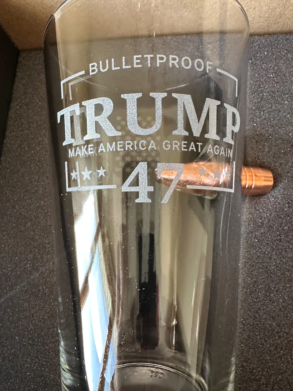 This 16oz beer glass features a .50BMG bullet and custom laser engraved with a distressed American Flag design. Each glass is hand embedded with a real, lead-free bullet.