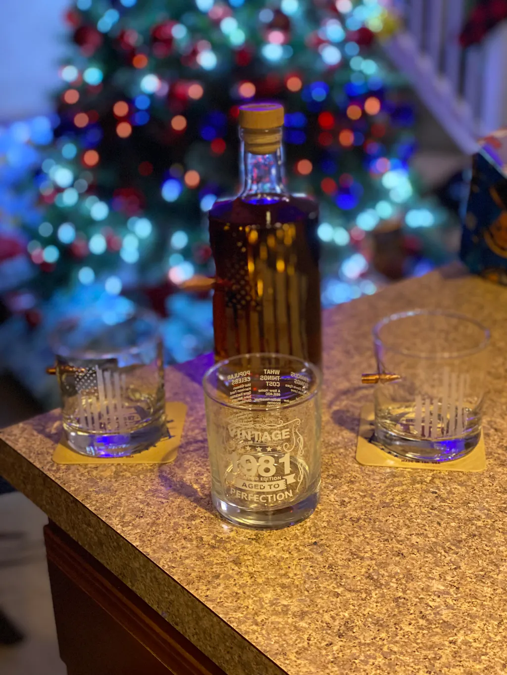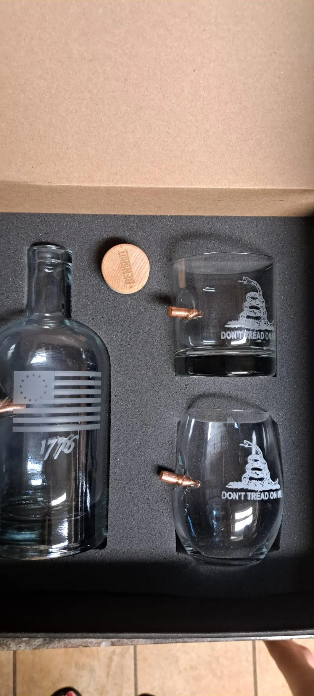 Elevate your whiskey collection with the bold presentation it deserves. This 750mL decanter features a real, lead-free solid copper .50BMG bullet, and arrives in a custom-built gift box with die-cut foam inserts and a maple wood topper. Also included are two 11oz rocks glasses embedded with a real, lead free .308 caliber bullet in their sides.